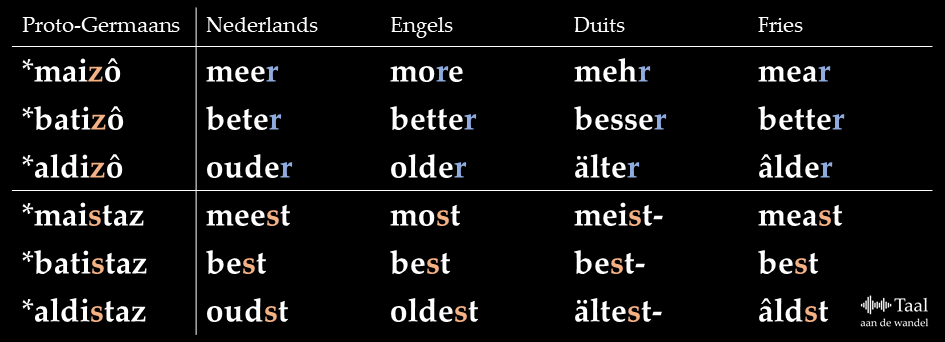De vergrotende trap van oud is ouder, en de overtreffende trap is oudst. De uitgangen -er en -st hebben nu niets meer gemeen, maar -er is het gevolg geweest van rotacisme. Als we dat terugdraaien, lijken ze ineens een stuk meer op elkaar.