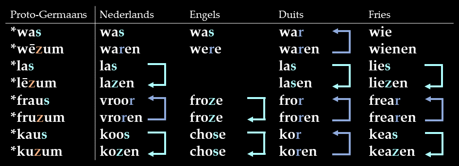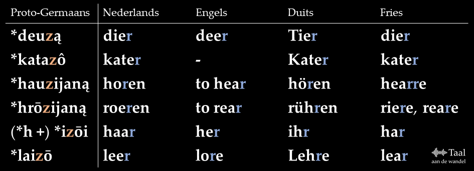 Op een bepaald moment veranderde in de voorloper van de Germaanse talen de /z/ in een /r/. Die verandering was wetmatig: in de regel werd elke /z/ een /r/. Veel hedendaagse woorden met een /r/ stammen van zo’n oud /z/-woord af. Hieronder vind je een aantal voorbeelden.2