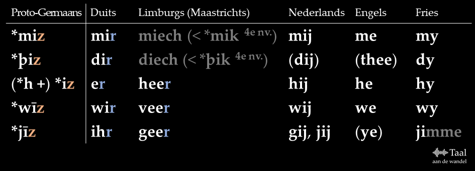 Het Duits heeft nog meer /z/’en via rotacisme bewaard: bij de persoonlijke voornaamwoorden. En het Duits is niet de enige taal: streektalen als het Midden- en Zuid-Limburgs doen mee. In onderstaand schema vind je een aantal voorbeelden van het Duits en het Maastrichts. Uit de woorden in de andere talen is de /z/ simpelweg verdwenen.