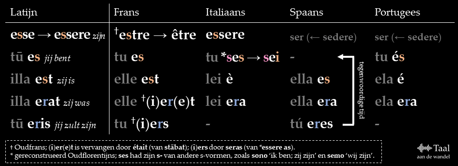 - Bijzonder is dat de Spaanse tegenwoordigetijdsvorm tu eres ‘jij bent’ van origine een toekomendetijdsvorm is: ‘jij zult zijn’. Toen door t-wegval de derde persoon est in es veranderde, dreigde hij samen te vallen met de jij-vorm es. Dat was niet handig, want in het Spaans wordt het onderwerp gewoonlijk weggelaten, dus je zou aan es niet meer hebben gehoord of het een jij- of hij/zij-vorm was. De oude toekomendetijdsvorm eres kwam te hulp en werd de nieuwe jij-vorm van de tegenwoordige tijd.