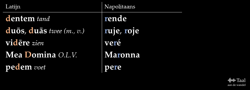 Dit /d/-rotacisme is overigens vrij frequent in de Italiaanse streektalen: ook in bijvoorbeeld het Napolitaans en het Sardijns vinden we /d/-rotacisme. Hier wat Napolitaanse voorbeelden: