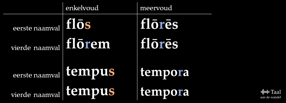 In het Latijn hadden onzijdige woorden in de vierde naamval dezelfde vorm als in de eerste. Onzijdige woorden met een s-r-alternantie hadden in de vierde naamval dus ook een /s/, in tegenstelling tot woorden als flōs. Tempus ‘tijd’ was in de vierde naamval dus niet *temporem, zoals flōrem, maar gewoon tempus. Het meervoud had wel een /r/: tempora. In onderstaand schema zie je de verschillen tussen woorden als flōs en woorden als tempus: