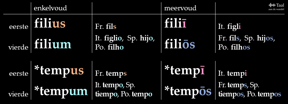 De naamvalsverschillen zijn weliswaar verdwenen, maar de Romaanse talen hebben natuurlijk nog wel een meervoud. Hebben de nazaten van de meervoudsvorm tempora die /r/ dan nog? Alleen in het Roemeens. Daar is het namelijk timp in het enkelvoud en timpuri in het meervoud. De andere Romaanse talen vonden tóch een manier om ook deze alternantie op te ruimen: tempus werd verbouwd tot een mannelijk us-woord, zoals fīlius ‘zoon’: