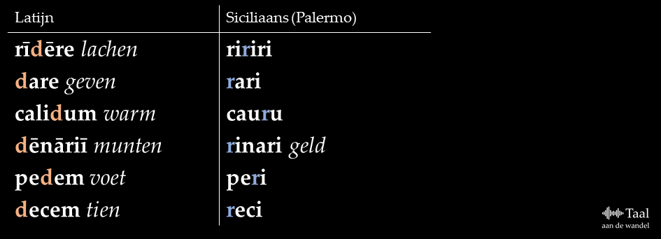 Steken we de zee over naar het zuiden, dan komen we op Sicilië. Daar vinden we /d/-rotacisme: in bepaalde posities is de /d/ in een /r/ veranderd. Hieronder volgen enkele voorbeelden uit Palermo.