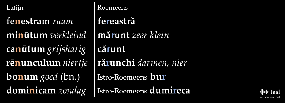 In deel 1 en tot nu toe in deel 2 heb ik alleen verteld over de /z/, /l/ en /d/ die in een /r/ veranderden. Dat zijn allemaal medeklinkers die je maakt door met je tong naar de tandkas te gaan. De /n/ is ook zo’n medeklinker, maar in de behandelde Germaanse en Romaanse talen zijn daar geen voorbeelden van. In het Romeens wel. We sluiten af met een aantal voorbeelden uit de standaardtaal en uit het Istro-Roemeens, dat gesproken wordt op het Kroatische deel van het schiereiland Istrië: