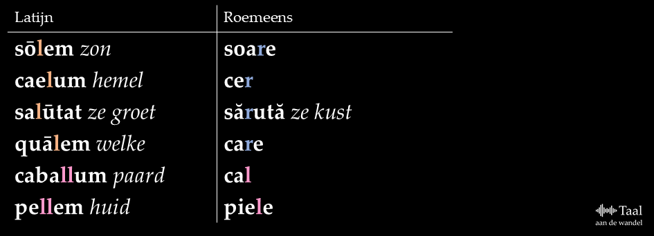 Ten eerste heeft het Roemeens een zeer vergaande vorm van /l/-rotacisme ondergaan: alle gevallen van een Latijnse /l/ tussen klinkers zijn /r/ geworden: sōlem ‘zon’ werd bijvoorbeeld soare. Die verandering moet al vroeg zijn opgetreden, want de dubbele oftewel lange /ll/ is niet aangetast: caballum ‘paard’ werd cal.3 Hieronder vind je enkele Roemeense voorbeelden. Daarna gaan we naar de zeldzaamste vorm van rotacisme.