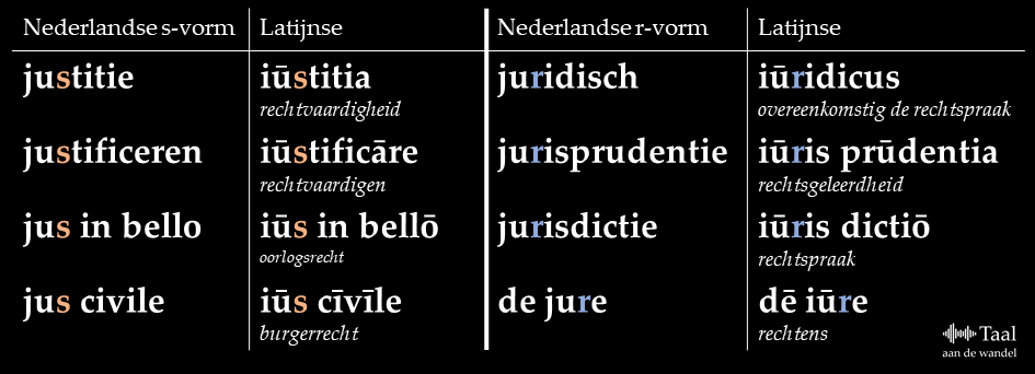 We hebben aardig wat termen uit het Latijn ontleend waar het Latijnse woord voor ‘recht’ in zit. Neem justitie en juridisch. Wat opvalt is dat het ene woord een /s/ heeft en het andere een /r/. Hoe komt dat? Rotacisme!