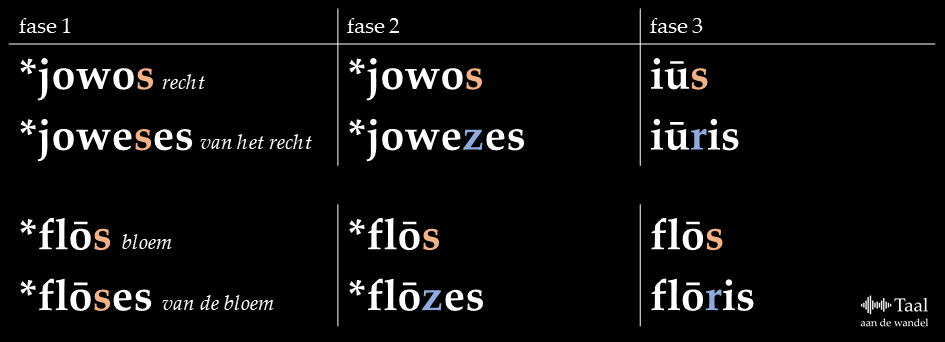In het vroege Proto-Italisch, de gereconstrueerde voorouder van het Latijn die zo’n duizend jaar voor Christus gesproken werd, hadden bovenstaande /r/-vormen nog een /s/: iūris was *joweses. Doordat die /s/ tussen klinkers stond, werd het een /z/: *jowezes. Dat kun je vergelijken met wat er in het Nederlands is gebeurd: muis heeft een /s/, maar muizen een /z/.