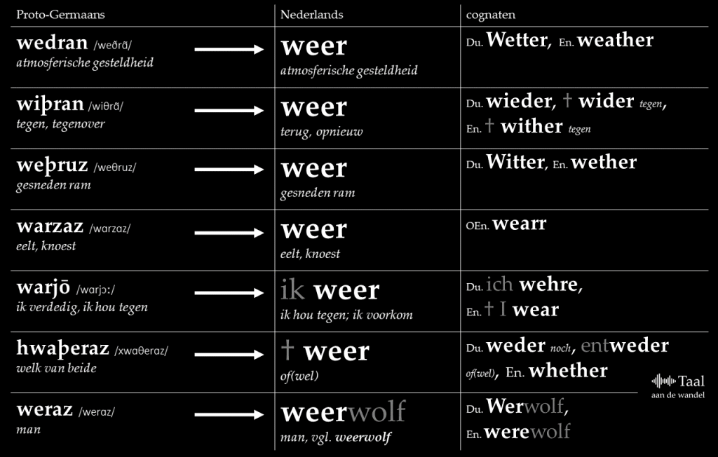 Met een beetje goeie wil kun je zelfs zeven verschillende weer-woorden onderscheiden, die in het Proto-Germaans niet op elkaar leken: