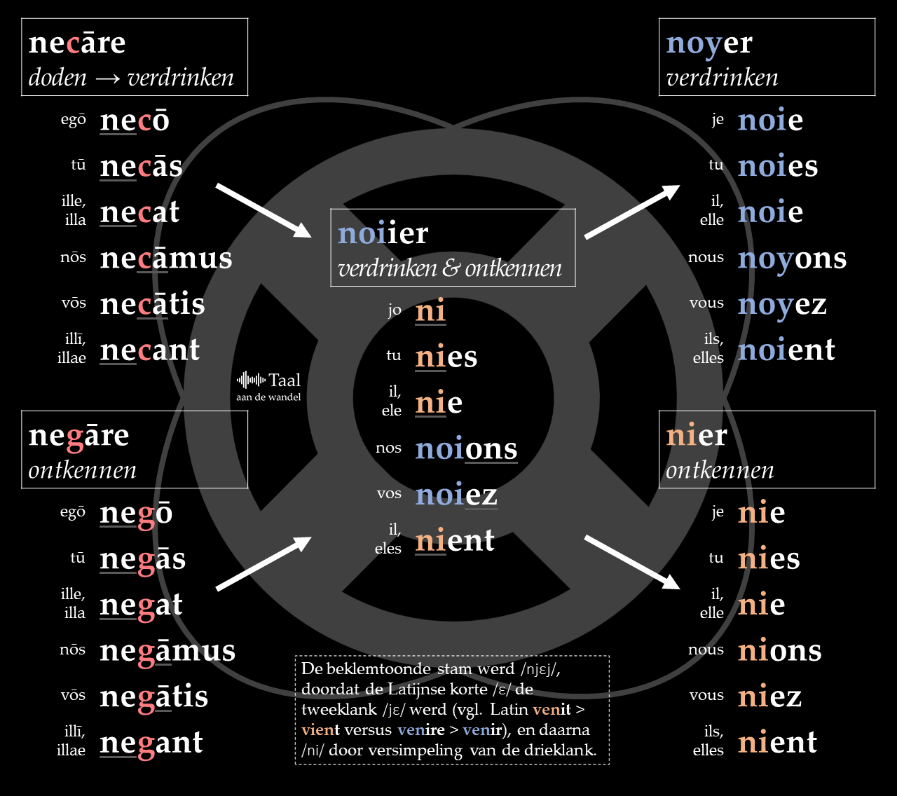 Voor necāre en negāre was die verdwijning slecht nieuws. De enige medeklinker die ze uit elkaar hield, verdween immers. Daardoor vielen ze samen tot neiier (uitspraak: /neej-jer/), dat in later Oudfrans noiier werd (uitspraak: /noi-jer/). Dat werkwoord had dus twee betekenissen gekregen: ‘verdrinken’ (ontstaan uit ‘doden door middel van verdrinking’) en ‘ontkennen’.