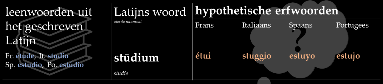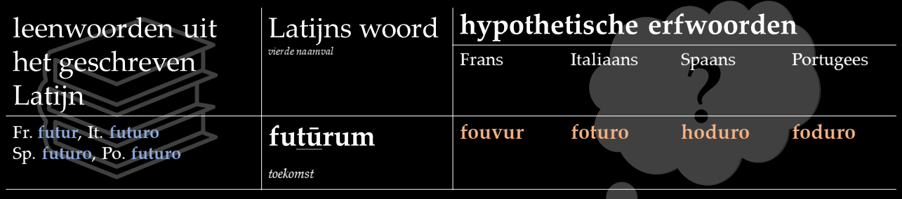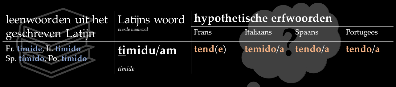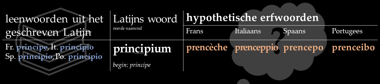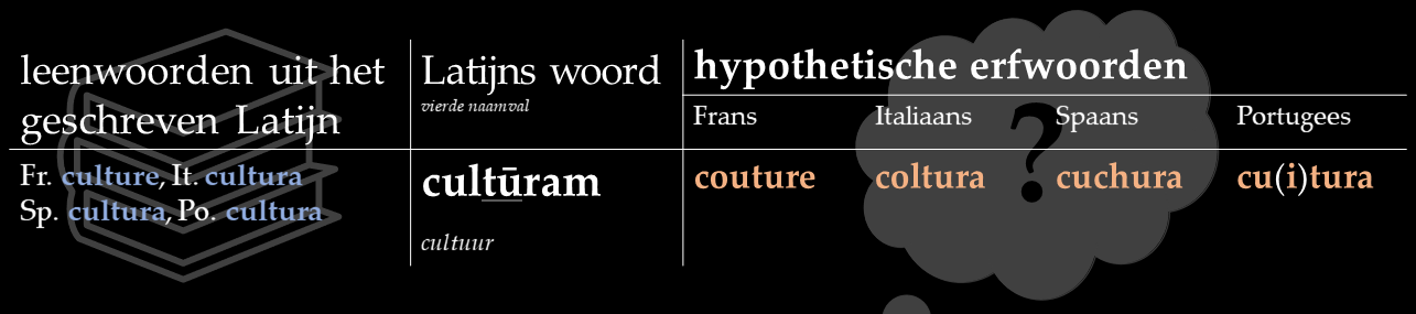 In dit stuk behandel ik dertien van zulke rechtmatige erfgenamen. Ik zet de hedendaagse ontleende vormen naast de hypothetische vormen die in het Frans, Italiaans, Spaans en Portugees ontstaan zouden zijn als het erfwoorden waren geweest. Zoals gewoonlijk kun je ook audio’s van deze reconstructies beluisteren.