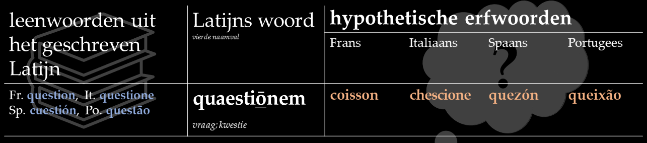 Op de qu- van quaestiōnem volgde oorspronkelijk een /ai/-achtige tweeklank, maar in de spreektaal werd dat een e-klank. Daardoor sloot het woord zich bij de groep van quem en quid aan en bleef alleen de [k] over. Om die reden – en nog andere – kunnen vormen als It. questione [kwestjone] en Sp. cuestión [kwestjon] met een [w]-klank niet authentiek zijn.