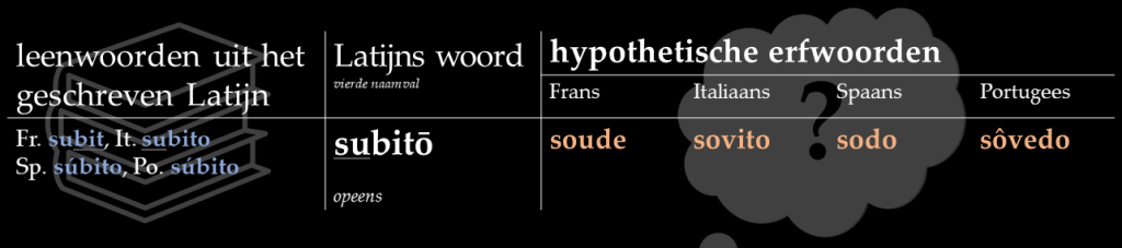 Het Latijnse subitō ‘opeens, plotseling’ vinden we terug als Fr. subit, It. subito, Sp. en Po. súbito. Dat het woord er in alle vier de talen tot aan de laatste klinker nog hetzelfde uitziet als in het Latijn, laat direct zien dat we met een leenwoord te maken hebben. Door de verschuiving van de klinkers (u > o) en de verzachting (b > v; t > d) of zelfs verdwijning (b > _) van de medeklinkers zouden de geërfde nazaten voor ons onherkenbare vormen hebben gekregen.