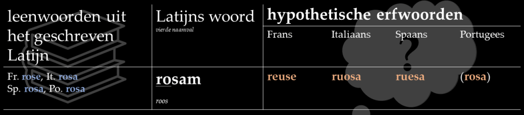 Het Latijnse rosam ‘roos’ had in het Frans *reuse, in het Italiaans *ruosa en in het Spaans *ruesa moeten worden. Het woord had in het Latijn namelijk een beklemtoonde korte o en die veranderde in deze drie dochtertalen in erfwoorden in een tweeklank. Vergelijk novam ‘nieuw (vr.)’, dat respectievelijk neuve, nuova en nueva werd.