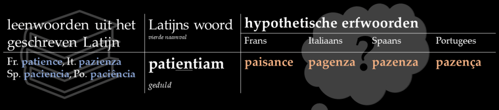 Het woord patientiam ‘geduld’ laat net als opīniōnem en principium zien wat een [j]-klank met de voorafgaande medeklinker kan doen.