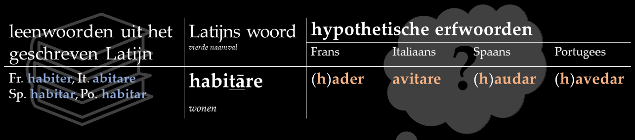 Habitāre heeft nog een hele tijd meegedaan met klankverschuivingen voordat het verdween. Dat weten we dankzij inscripties. Zo bevat het Corpus Inscriptionum Latinarum de tekst IC AVETAT ‘hier woont’ in plaats van het klassieke HIC HABITAT. De spelling laat zien dat de h is weggevallen, de i een e is geworden, en de [b] is samengevallen met de eerdere [w] tot – wat we dankzij andere aanwijzingen weten – de /w/-achtige medeklinker [β], die het Spaans nog altijd heeft in woorden als haber.