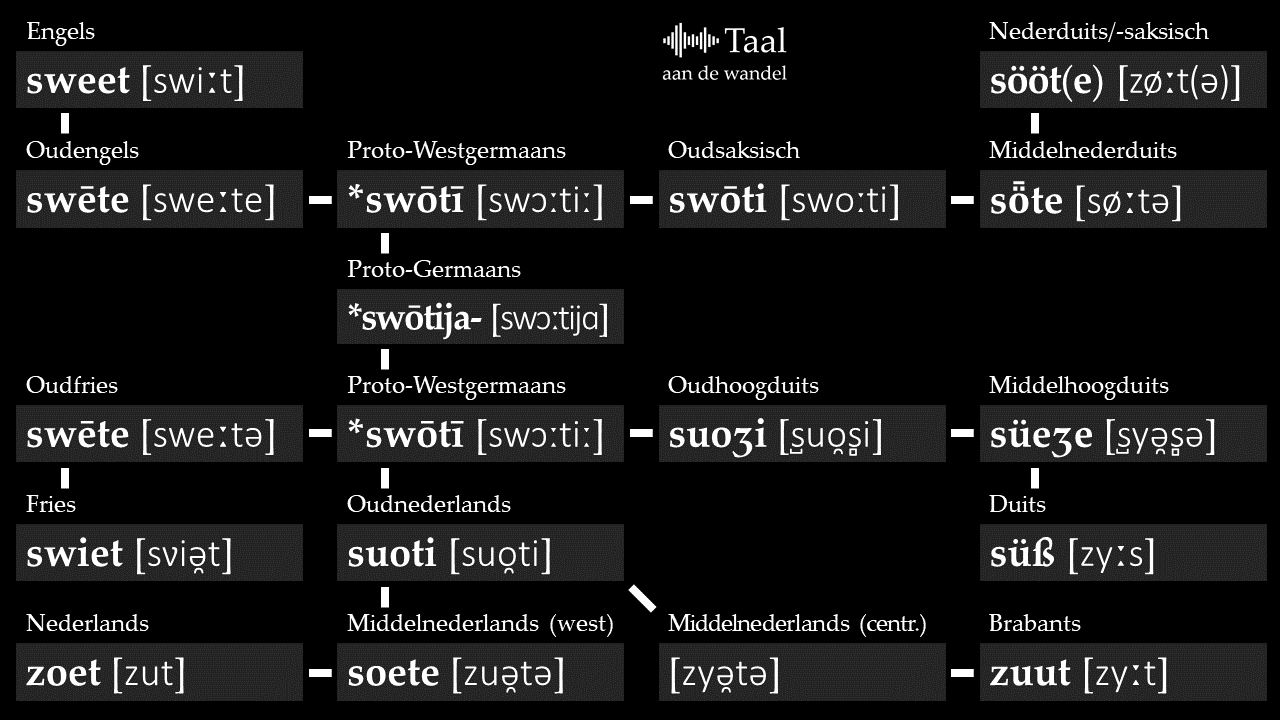 Uit het Proto-Germaanse *swōtija- ‘zoet’ is in de Westgermaanse talen een groot scala aan vormen ontstaan. In het Nederlands werd het woord bijvoorbeeld zoet, in het Engels sweet, in het Duits süß en in het Fries swiet. Hoe zijn al die verschillende vormen uit één en hetzelfde *swōtija- ontstaan? In dit artikel leg ik dat uit en op het eind laat ik het horen.