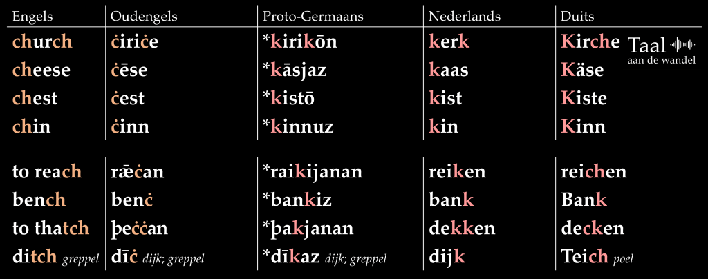 De klinker waardoor de /k/ veranderde, hoefde er niet op te vólgen: hij kon er ook aan voorafgaan. Ons woord dijk is bijvoorbeeld familie van het Engelse ditch (dat ooit net als dijk ‘dam’ betekende maar nu de betekenis ‘greppel’ heeft).