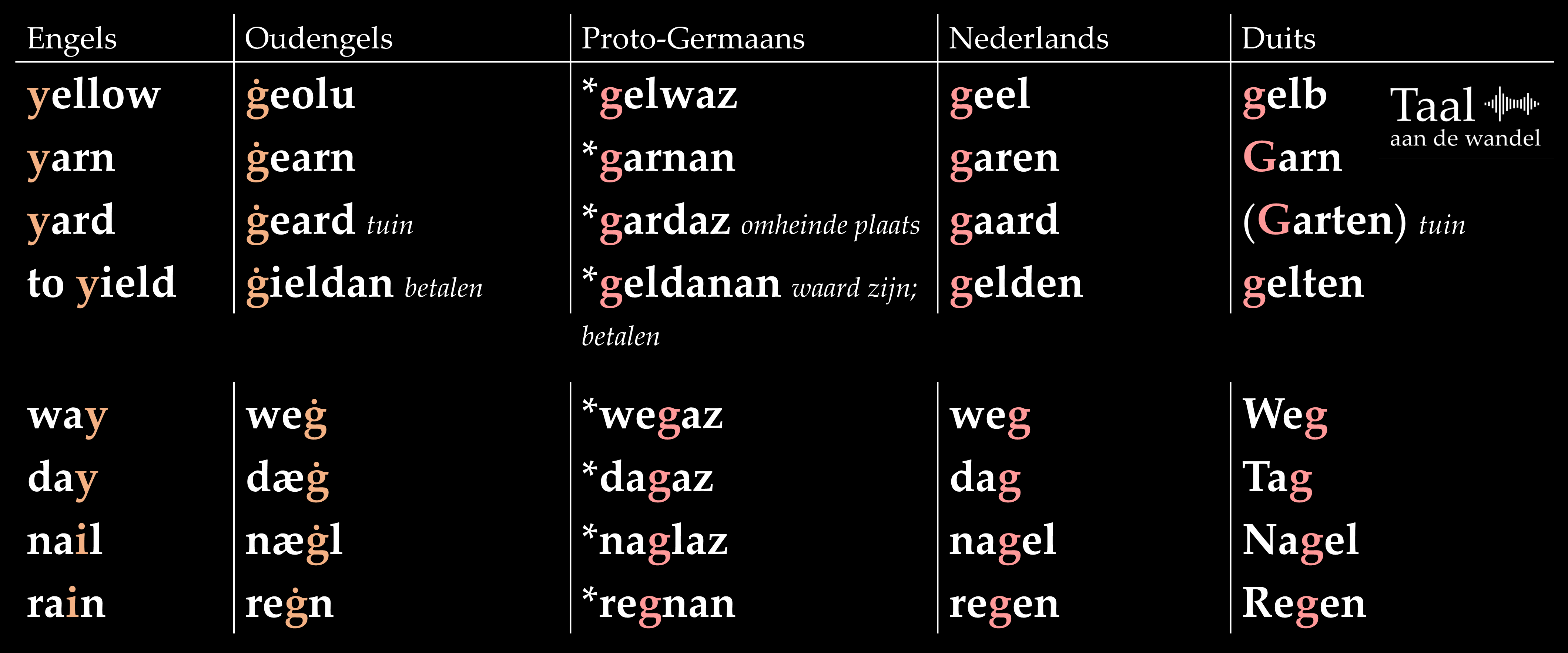 Het Nederlands heeft in sommige gevallen precies het tegenovergestelde van het Engels gedaan: het heeft in woorden met een voorklinker juist een g gemaakt van een Germaanse /j/. Gist, ginder en gij komen bijvoorbeeld van de West-Germaanse woorden *jestu, *jaenar en *jī. In het Oudnederlands werd de /j/ in die woorden zo sterk uitgesproken dat hij in het vaarwater van de zachte g kwam en er uiteindelijk mee samenviel. Het Engels heeft in yeast, yonder en ye dus juist de oorspronkelijke situatie behouden.