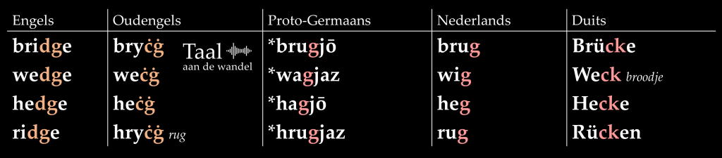We hebben gezien dat de Germaanse g in het Engels een /j/ werd en dus geen /dzj/-klank zoals de Latijnse /ɡ/ in het Italiaans. Toch is er één situatie waarin zo’n /dzj/-klank wél ontstond: waar de West-Germaanse g verdubbeld was. In die gevallen werd het namelijk wél een Google-/ɡ/, en die veranderde vervolgens net als in het Italiaans in een /dzj/-klank: *brugjō (zachte g) veranderde via *bruggju (dubbel: /ɡɡ/) in bryċġ (nu met /dzj/) en uiteindelijk in bridge (nog steeds /dzj/). Hieronder hoor je die ontwikkeling. Daaronder staan verdere voorbeelden.