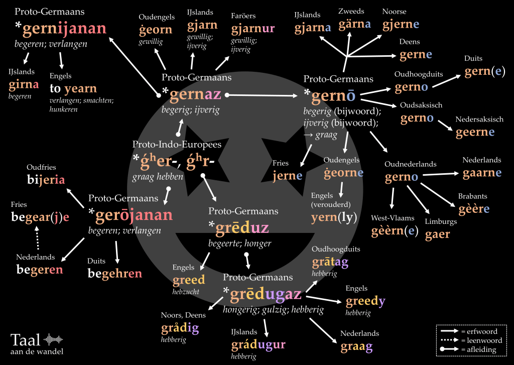 Vrijwel afwezig in de streektalen maar alomtegenwoordig in het Standaardnederlands is het woord graag. Het gaat terug op de oudere, niet in teksten aangetroffen vorm *gradig. De d en de i zijn weggevallen tussen de twee klinkers, zoals ook in gestaag (van gestadig) en leeg (van ledig). Graag is dan ook verwant aan het Engelse greedy ‘hebberig’.