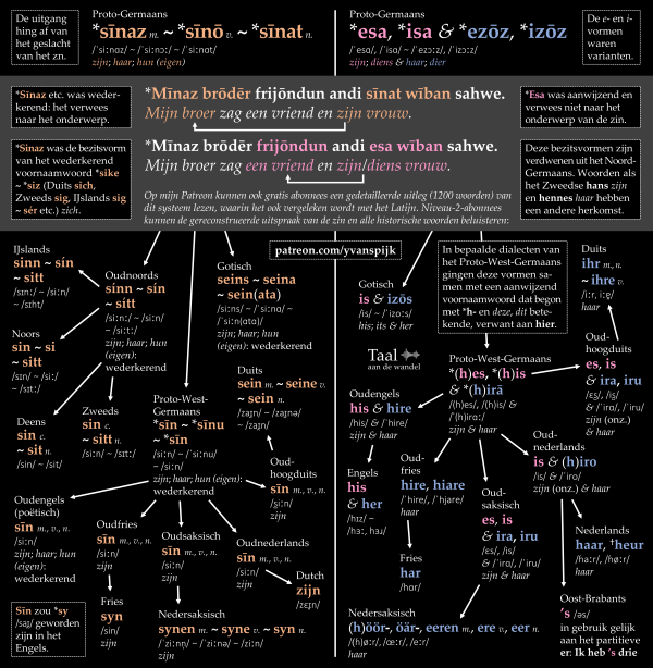 De Proto-Germaanse voorloper van ons bezittelijk voornaamwoord zijn was genderneutraal: *sīnaz kon ‘van hem’, ‘van haar’ en ‘van hen’ betekenen. Dat weten we doordat zijn nakomelingen in het Oudnoords, het Gotisch en het Oudengels, vroege Germaanse dochtertalen, nog steeds al die functies hadden, en in de huidige Noord-Germaanse talen, zoals het Noors en Zweeds, geldt dat tot op... Lees verder →