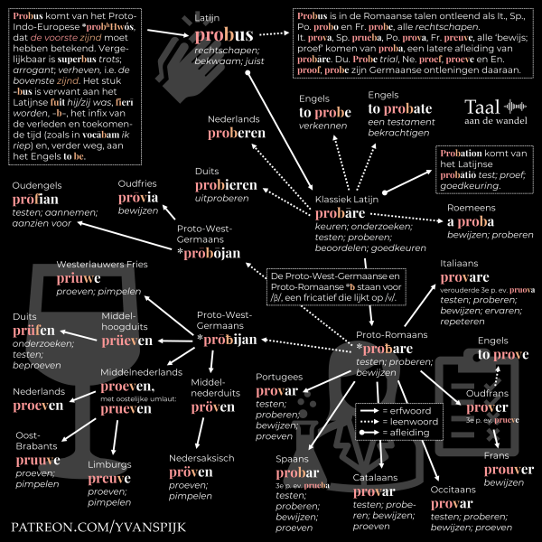Het werkwoord proeven ziet er oer-Nederlands uit, maar dat is het niet. Het vindt zijn oorsprong in het Latijnse probāre, dat volgens het woordenboek van Pinkster (2003) onder andere ‘keuren; testen; onderzoeken; proberen; beoordelen; goedkeuren’ betekent. Probāre is ook een tweede maal ontleend, namelijk als proberen. Het Latijnse probāre is zelf een afleiding van het... Lees verder →