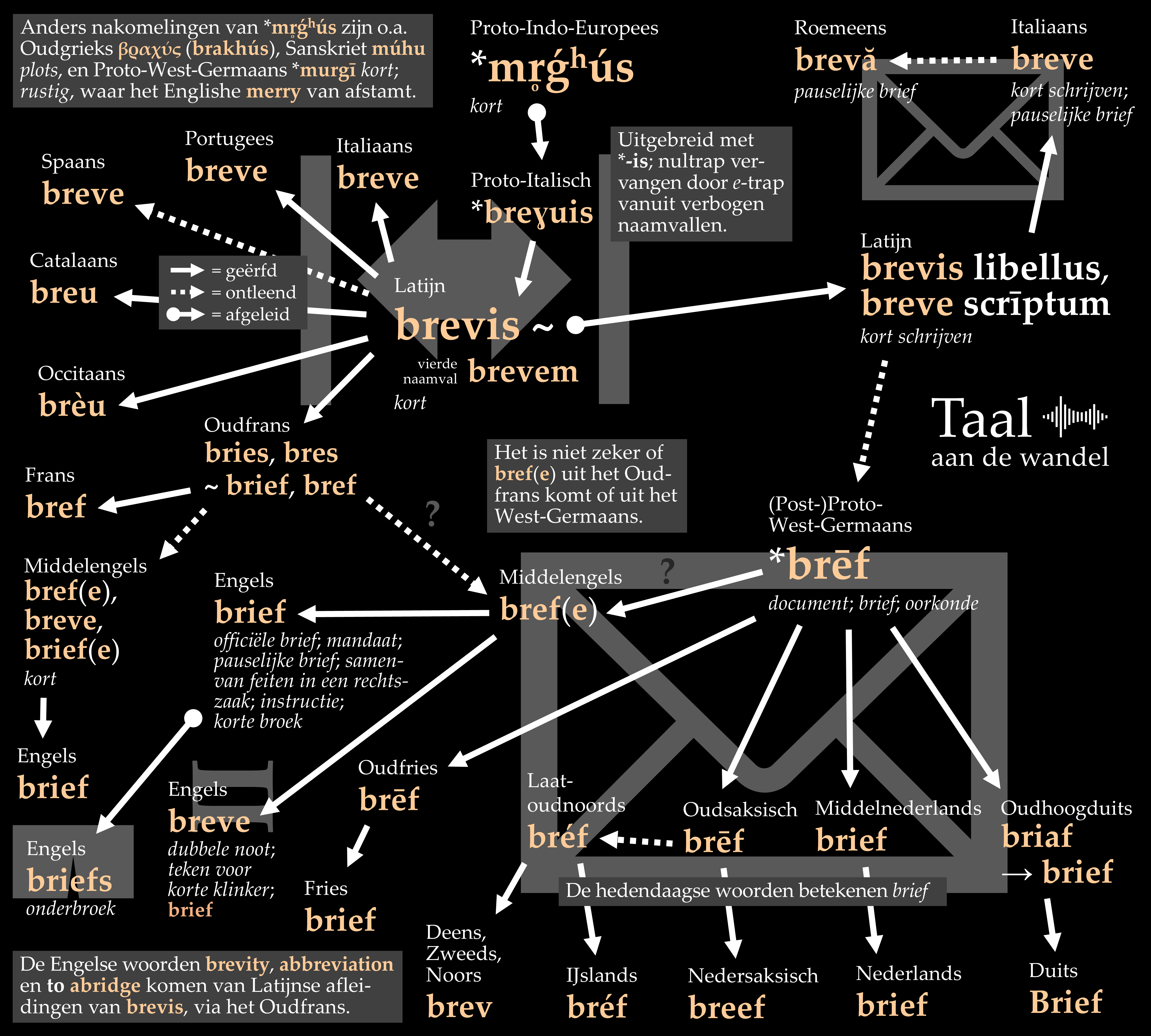 Voor het maken van de infographic die je hierboven ziet, dook ik onlangs in de etymologie van het woord brief. Hoe Nederlands dat woord er ook uitziet, het is ontleend aan het Latijnse breve, dat ‘kort’ betekent. Die ontlening heeft al heel lang geleden plaatsgevonden, maar de bronnen die ik raadpleegde, bleken van mening te verschillen over de vraag hóé lang geleden dat precies is gebeurd. Twee etymologische woordenboeken stellen dat breve al overgenomen is in het Proto-Germaans, de vroegste fase van de Germaanse talen, maar volgens een ander werk is het woord pas ontleend in het latere West-Germaans.